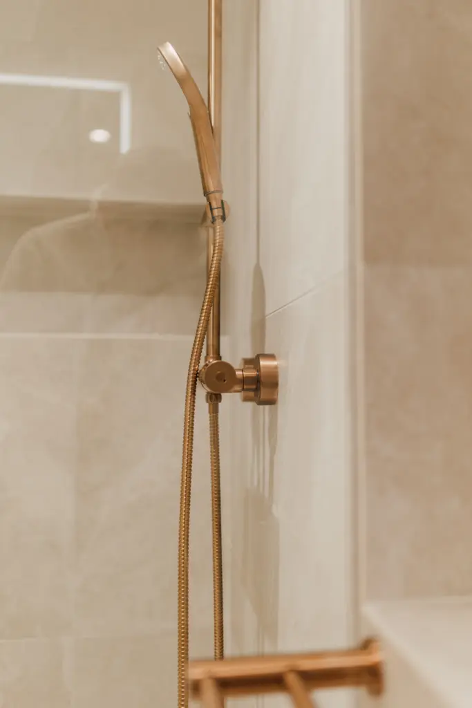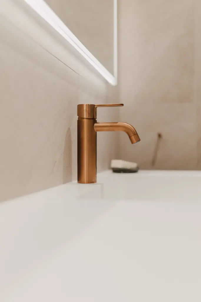 • Fliser: Shale Sand 60×60 fra Flisekompaniet • Armaturer og tilbehør: Korsbakken Silhuet i børstet kobber